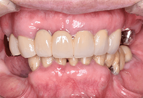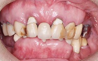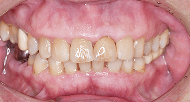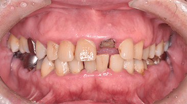 適合の悪い修復物を除去、仮歯を装着。その後、歯周外科手術により 上下顎前歯部の歯肉形態を改善し、最終修復物により治療を行った。 |